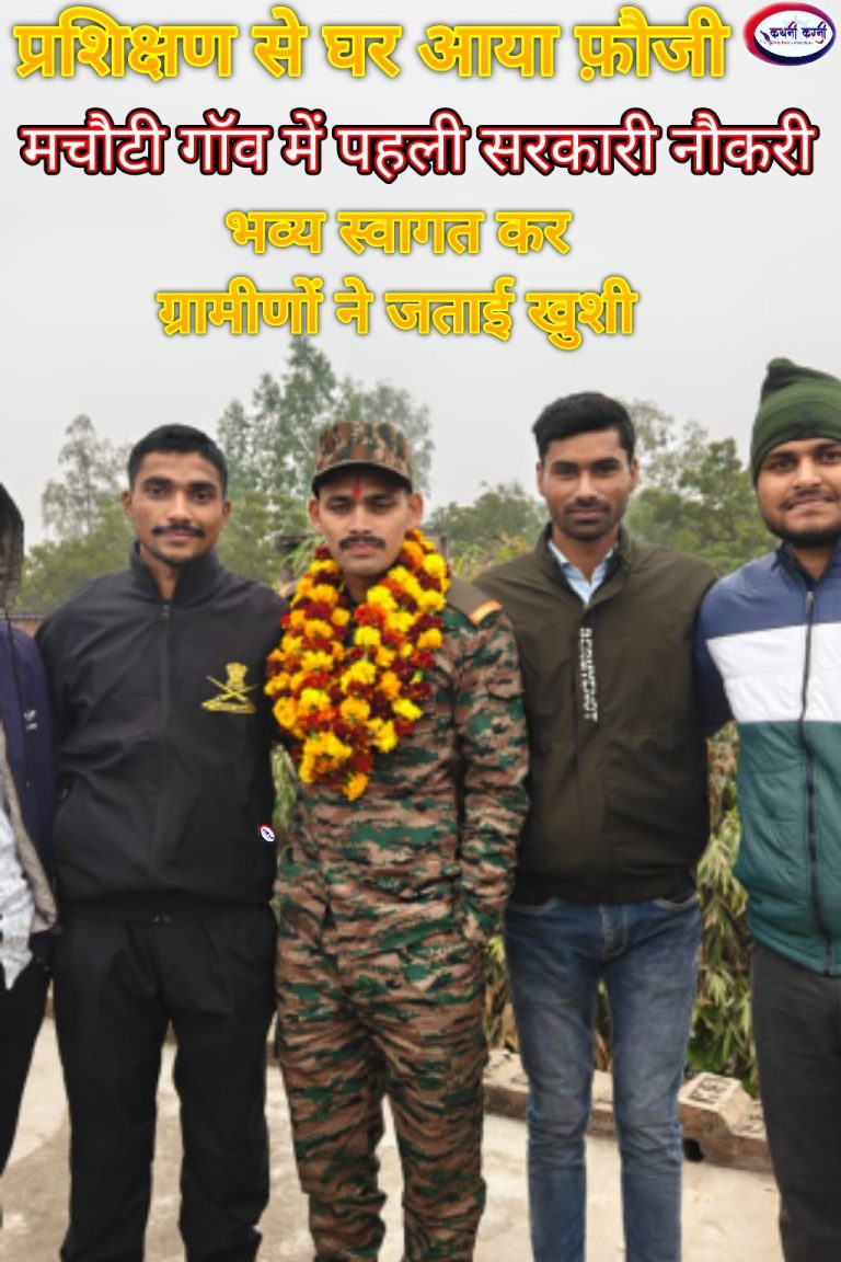 बताते चलें कि विकासखंड देवा के ग्राम मचौटी मजरे करौंदा निवासी गुरुशरन यादव के बड़े सुपुत्र अंकित कुमार यादव शुक्रवार को जब आठ महीने का फौजी प्रशिक्षण प्राप्त कर घर वापस आए तो गांव में एक साथ होली-दीवाली जैसा माहौल व्याप्त हो गया। फौजी के स्वागत के लिए सैकड़ों लोग फूल मालाओं के साथ इंतजार कर रहे थे। जिस समय चारबाग रेलवे स्टेशन से फौजी एक चार पहिया वाहन से अपने गांव पहुंचे तो ग्रामीणों ने जगह जगह पर फूल-माला पहनाकर भव्य स्वागत किया। ग्रामीणों के मुताबिक मचौटी गांव में इससे पहले कोई सरकारी नौकरी में नहीं था। यह पहली सरकारी नौकरी है और वह भी देश की सेवा करने वाली नौकरी के कारण सारे गांव में खुशी का माहौल देखा गया। भाइयों में सबसे बड़े अंकित कुमार यादव क्रमशः अभिषेक यादव, राज यादव, रिभा यादव, शिवा यादव कुल पांच भाई-बहनों व माता मायावती यादव सहित पूरे परिवार में खुशियों का बाजार था। अंकित कुमार यादव अपनी सफलता का श्रेय अपने माता पिता, गुरुजनों एवं मार्गदर्शक साथियों को दे रहे हैं। स्वागत कर्ताओं में प्रहलाद यादव, प्रमोद कुमार यादव, देवराज यादव, कुलदीप यादव, शुभम यादव, आशीष यादव, शिवकरन यादव, सुमत सिंह यादव, गंगाराम यादव, संदीप यादव, लल्लू यादव, प्रदीप यादव, चंद्र दीप यादव, राम सागर यादव, हरी प्रसाद, राम अधीन, सुंदर लाल, रोली यादव, रोमल यादव, लकी यादव सहित सैकड़ों लोग मौजूद रहे।