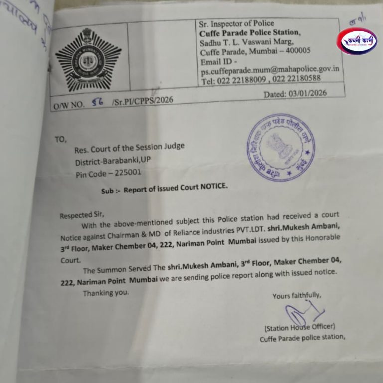 बाराबंकी। रिलायंस इंडस्ट्रीज के बायो गैस प्लांट से संचालित मानक विहीन डंपर और ट्राला की मनमानी रफ्तार और कारगुजारी के खिलाफ समाजसेवी मनीष मेहरोत्रा द्वारा कोर्ट कक दरवाजा खटखटाया गया था। कोर्ट ने मामले की संजीदगी को देखते हुए प्राप्त साक्ष्याे के आधार पर मामले में कार्रवाई शुरू कर दी है। जिसके बाद कोर्ट के आदेश पर मुंबई पुलिस ने रिलायंस कम्पनी के हेडक्वार्टर पर कोर्ट का सम्मन भेजा गया है।